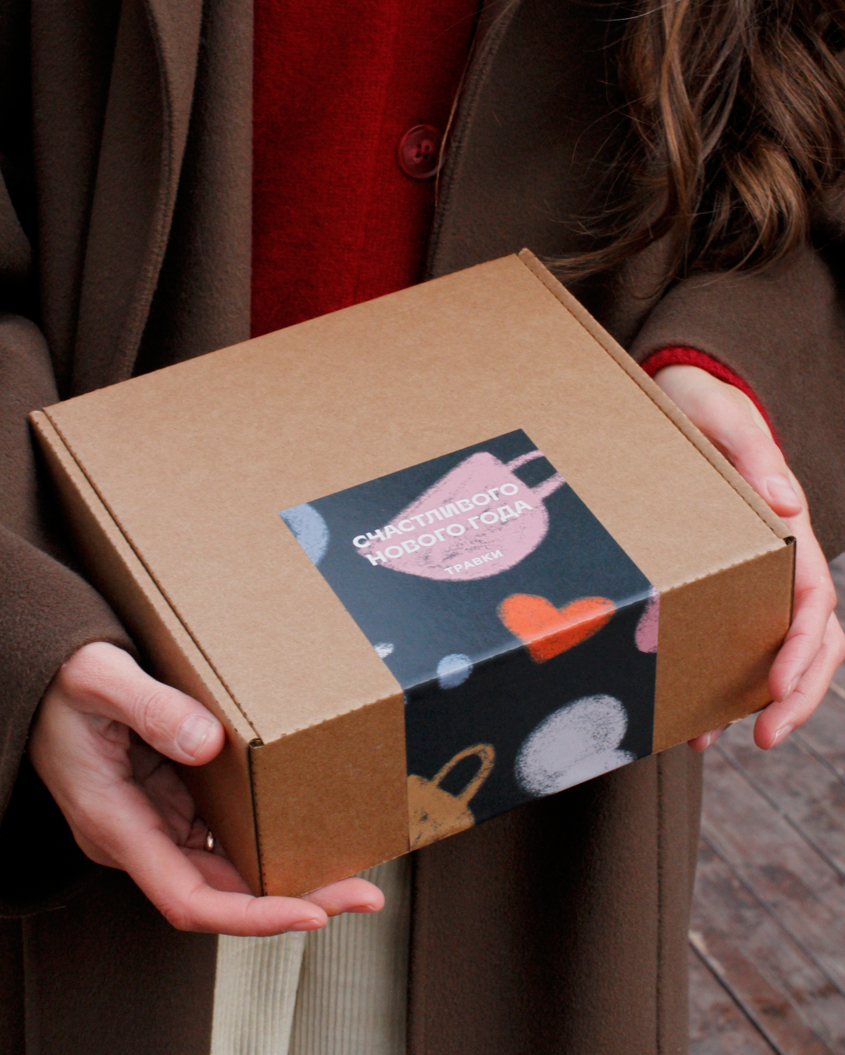 Набор упакован в крафтовую коробку с праздничной наклейкой.